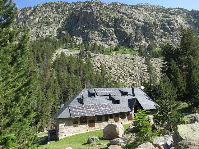 Mar sokat hallottunk a refugies-ekrol, a hazakrol, ahol egy kis osszegert ott lehet ejszaka aludni, van zuhany (altalaban hideg, de van), es par helyen meg reggelit is kapsz. Mindig azt hittuk, hogy ezek a helyek borzalmasak, de amikor meglattuk ezt egybol a to mellett a napelemekkel a teton, meggondoltuk magunkat. Jol neztek ki, tisztanak es jol karban tartottnak tuntek. A lenyeguk, hogy ahelyett, hogy ki-es bemaszol a parkba minden nap, azzal, hogy itt alszol idot (es penzt) sporolsz meg, tobbet tudsz kirandulni es tobbet latsz a parkbol. Rengeteg fiatal kirandul igy. Az Ordesa-volgyben lattam hirdeteseket egyhetes turakra, ahol ilyen helyeken alszanak es megmasszak az osszes kornyezo csucsot.